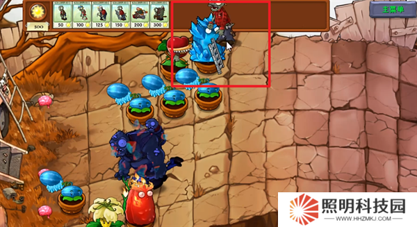 6、第一行的食人花將礦工僵尸殺掉之后,再放置一個(gè)梯子僵尸。