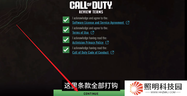 1、玩家們啟動游戲之后,首先需要將所有的條款都打勾,然后點擊下方的繼續按鈕。