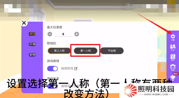 4、進入到空房間的模板之后,玩家們要再右邊的【設置】里面將照相機調整成【第一人稱】。
