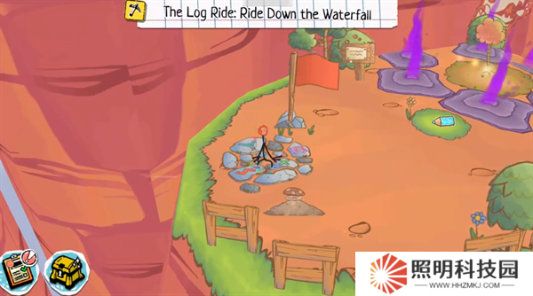 1、玩家們首先需要跟隨著劇情來進行冒險,在地圖上面拾取帶有工具圖案的畫板,比如在懸崖旁邊拾取到鎬子的畫板。