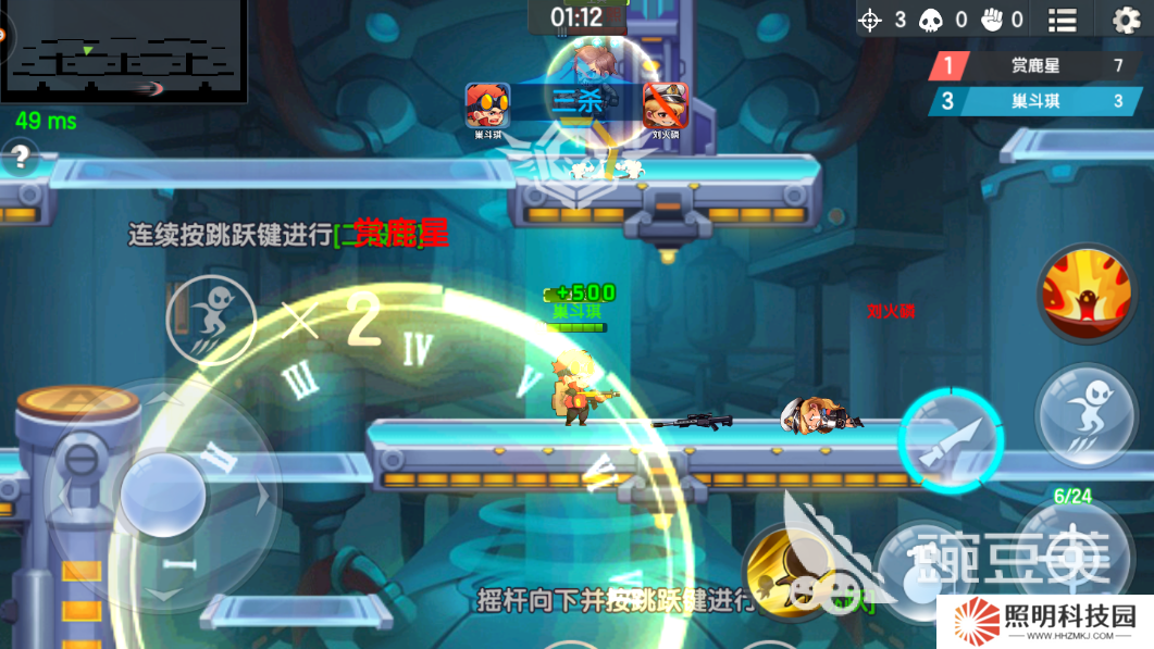 在戰斗中我們一共有6個按鍵,分別是手雷,跳躍,開火,閃現,大招,近戰攻擊。游戲中我們可以看到自己的血條與敵人的血條,游戲人物移動的頻繁,我們需要做的就是最短的時間擊殺最多的對手。