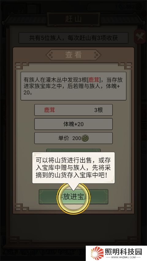 9、采摘后點擊放進寶庫,你可以將山貨進行出售、也可以存入寶庫贈與族人;