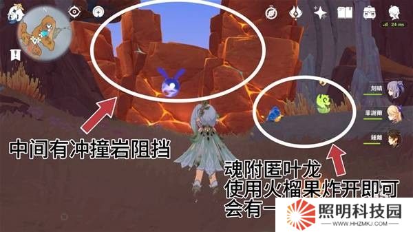 途中會遇到沖撞巖阻擋,可以使用基尼奇的技能、魂附匿葉龍,或使用瓦雷莎/伊安珊直接撞碎。清理沖撞巖后,還能獲得一個普通寶箱!