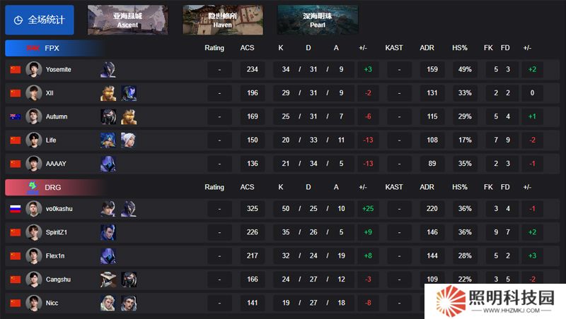 圖一亞海懸城,DRG 13:11 FPX,圖二隱世修所,DRG 13:5 FPX。vo0kashu選手拿到了全場最高的50總擊殺。