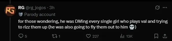 給那些想知道情況的人說明一下,他一直在給每個玩《無畏契約》的女孩發私信,試圖撩她們。