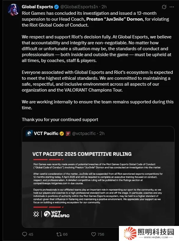 我們完全尊重并支持拳頭游戲的決定。在全球電競(Global Esports),我們認為勇于擔責和秉持誠信是不容置疑的原則。無論情況多么艱難或令人遺憾,教練、工作人員和選手都必須時刻堅守賽場內外的行為規范和職業操守。