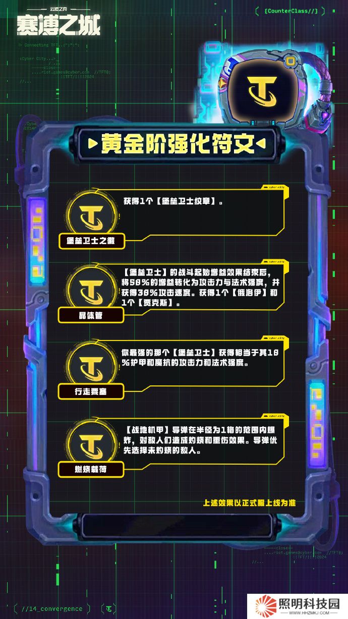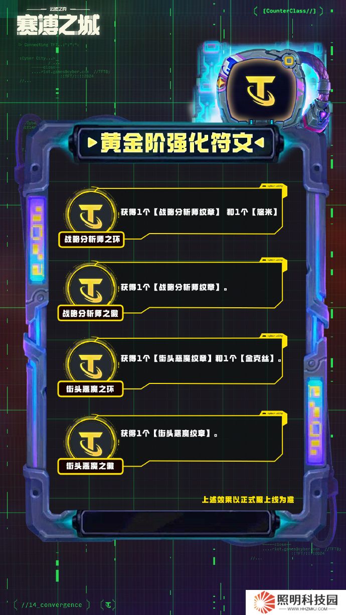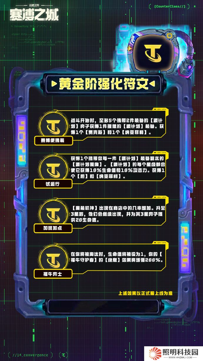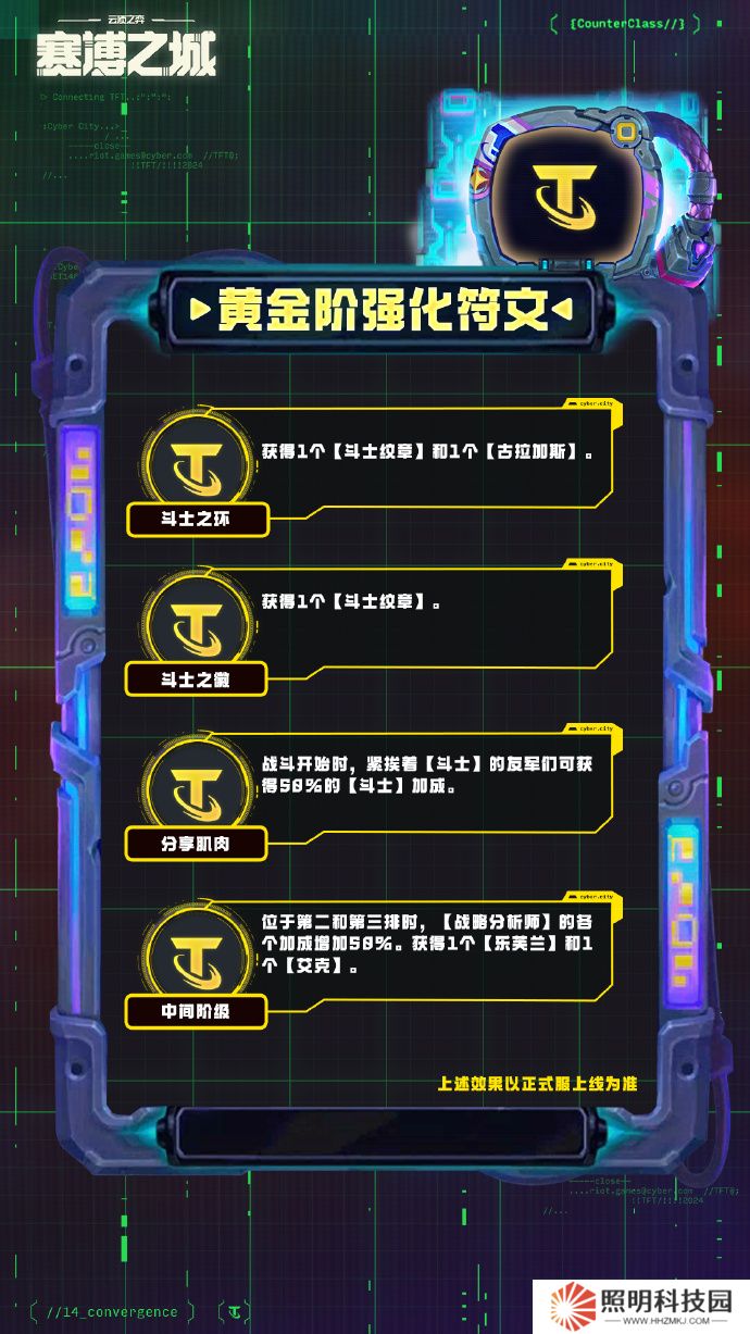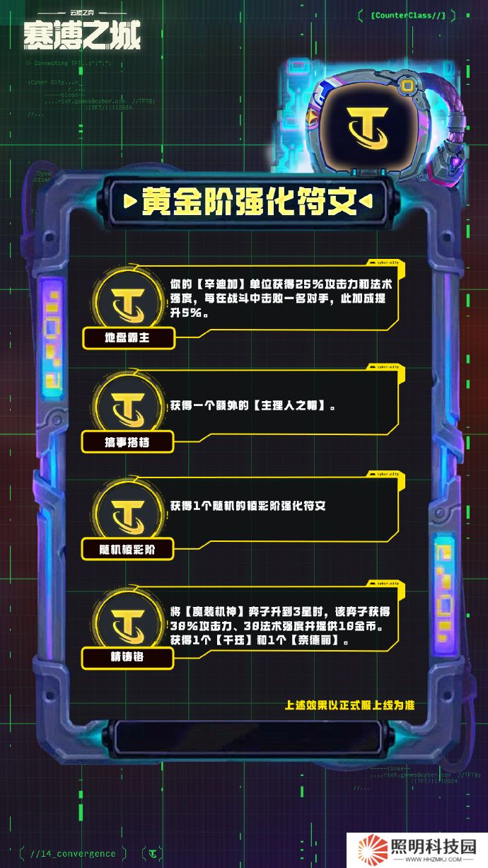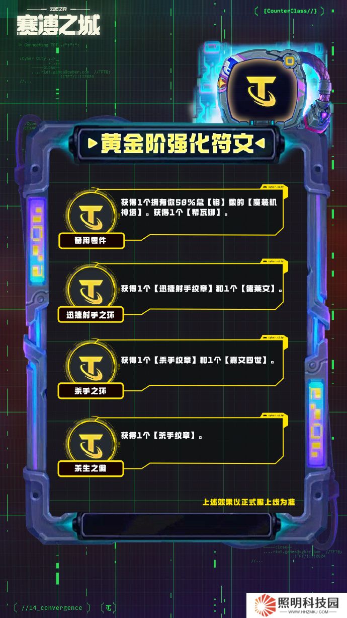 云頂之弈即將迎來S14賽季賽博之城,在這個賽季將會上線全新的黃金階強化符文,那么大家知道黃金階強化符文究竟是怎么樣的呢?下面快跟隨本站小編為大家帶來的云頂之弈S14黃金階強化符文吧。