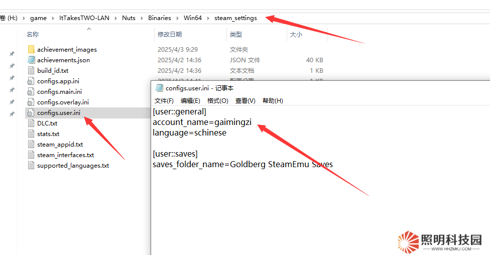 雙人成行改名字教程:記事本方式打開(kāi)NutsBinariesWin64steam_settingsconfigs.user.ini,找到account_name=gaimignzi,把gaimignzi改成自己想要的名字。