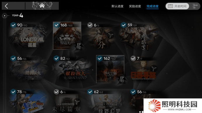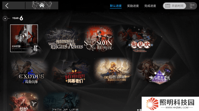 通過點擊上方的按鈕來切換樂章的排列順序。選擇【獎勵進度】與【完成進度】的排列順序后,您可以便捷地查看【章節】重要獎勵及源石獲取情況。