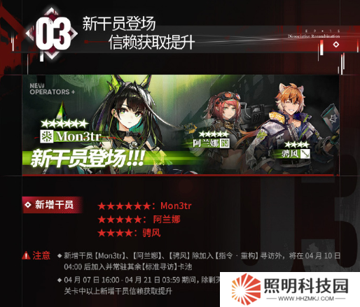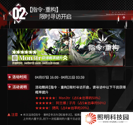 【指令·重構】限時尋訪開啟,時間:4.7~4.21,包括六星的Mon3tr,五星的阿蘭娜、子月、四星的聘風